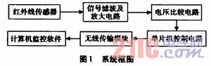 該系統(tǒng)的總體結(jié)構(gòu)框圖如圖1所示:通過(guò)RE200B熱釋電紅外傳感器對(duì)周圍環(huán)境的紅外線進(jìn)行實(shí)時(shí)數(shù)據(jù)采集。當(dāng)有人進(jìn)入傳感器的探測(cè)范圍時(shí),傳感器將感應(yīng)到的信號(hào)傳輸給下一級(jí)的放大濾波電路,經(jīng)過(guò)放大并濾除干擾的電信號(hào)再通過(guò)電壓比較電路,能將人的進(jìn)出兩個(gè)方向很好地識(shí)別出來(lái)。接著通過(guò)單片機(jī)編程將代表不同方向的信號(hào)轉(zhuǎn)換為人數(shù)變化的信號(hào),同時(shí)通過(guò)串口編程將人數(shù)的變化信息通過(guò)無(wú)線模塊發(fā)送到計(jì)算機(jī),通過(guò)計(jì)算機(jī)監(jiān)控軟件將人數(shù)統(tǒng)計(jì)信息以圖形界面的方式實(shí)時(shí)顯示出來(lái)。