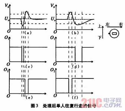 紅外熱釋電傳感器BE200B的輸出信號(hào)非常微弱,且信號(hào)中含有因環(huán)境引起的噪聲信號(hào),所以必須對(duì)信號(hào)進(jìn)行濾波放大。在電路中使用LM324構(gòu)成280倍放大電路,并通過(guò)電位器R3調(diào)節(jié)偏置電壓,使靜態(tài)輸出電壓盡可能平穩(wěn)于U0(圖3),但此時(shí)信號(hào)受環(huán)境溫度影響無(wú)法保證穩(wěn)定性,所以增加一級(jí)微分電路,通過(guò)調(diào)節(jié)電位器R11使微分電路靜態(tài)輸出不受環(huán)境溫度影響穩(wěn)定于U0附近,當(dāng)有人或紅外源從左右方向經(jīng)過(guò)傳感器窗口時(shí)可以看到微分電路輸出Vb會(huì)隨人通過(guò)方向不同而不同(圖3(a)(b))。