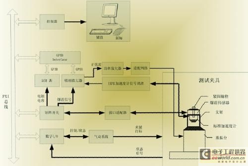 測(cè)試系統(tǒng)原理如圖4所示。振動(dòng)測(cè)試采用相對(duì)法,實(shí)現(xiàn)對(duì)汽車爆震傳感器3kHz~40kHz頻帶范圍內(nèi)任意頻率點(diǎn)的靈敏度測(cè)試,并可以對(duì)電容、絕緣電阻等檢測(cè)。測(cè)試系統(tǒng)采用PXI構(gòu)架,通過PXI模塊化儀器或GPIB儀器實(shí)現(xiàn)控制及信號(hào)采集。