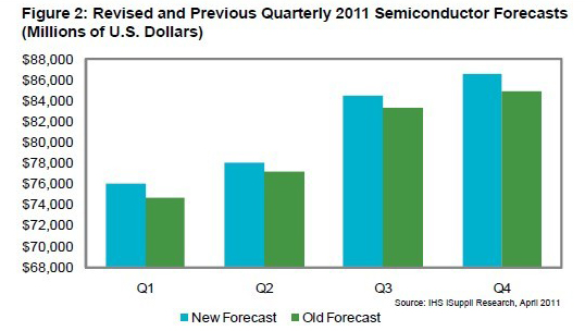 2011年每個(gè)季度的半導(dǎo)體銷售額都將高于先前的預(yù)估,如下圖所示。
