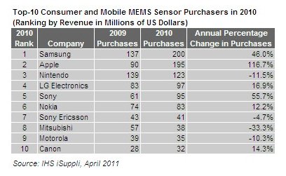 2010年十大MEMS傳感器采購(gòu)商(騰訊科技配圖)