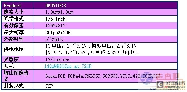 比亞迪微電子推出的HD 720P產(chǎn)品的型號(hào)是BF3710CS,是一款1/6inch采用0.13um工藝的百萬(wàn)像素圖像傳感器,像素尺寸為1.9umx1.9um,有效像素為1297x817,支持16:10和16:9的窗口。內(nèi)部集成了AE、AWB、AGC,Lens shading,Gamma校正等多種ISP處理功能,以及CDS噪聲消除電路,輸出Bayer RGB,RGB444,RGB555, RGB565,YCbCr422,CCIR656等多種圖像格式,滿足大多數(shù)后端處理器的接口需求。內(nèi)部集成了LDO,可單路電壓供電,節(jié)省外圍器件和PCB空間。