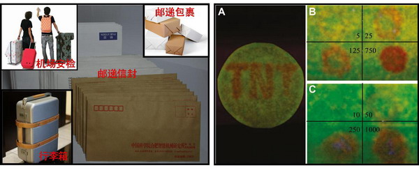 探測(cè)可疑包裹、郵件和恐怖分子隱藏在身上的炸藥一直是國(guó)際反恐和公共安全領(lǐng)域高度關(guān)注的課題。由于硝基爆炸物具有低蒸氣壓和高爆炸性,目前機(jī)場(chǎng)安檢主要依賴離子遷移譜和X射線衍射裝備,但難以做到快速、及時(shí)和低成本的探測(cè)。智能所課題組研究人員設(shè)計(jì)構(gòu)建了雙發(fā)射波長(zhǎng)的量子點(diǎn)比率熒光探針。探針的綠色熒光易受梯恩梯的影響發(fā)生淬滅,而紅色熒光不受影響,從而發(fā)生從綠色到紅色的顯色反應(yīng)。科研人員利用指紋提取技術(shù),進(jìn)一步研發(fā)出了方便操作的梯恩梯指示試紙。當(dāng)信封、合成纖維、包裹、橡皮等表面黏附肉眼看不見的梯恩梯殘留微粒時(shí),用這種試紙簡(jiǎn)單擦拭即可顯示顏色變化,靈敏度達(dá)到5納克/平方毫米。