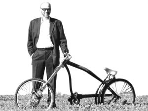 這輛自行車的設(shè)計(jì)和普通的自行車不太一樣,兩根長(zhǎng)長(zhǎng)的鋼管連接把手和前輪,坐凳設(shè)置比較低,要是裝上發(fā)動(dòng)引擎,酷似美國(guó)1969年公映的電影《逍遙騎士》中的摩托車,有些嬉皮風(fēng)。別看這兩根鋼管又細(xì)又長(zhǎng),正是因?yàn)槿绱颂貏e的設(shè)計(jì)才讓這輛自行車那么引人注目——是它使得自行車既不再需要凸制剎車把手,也不再需要長(zhǎng)長(zhǎng)的如蛇般的剎車線。