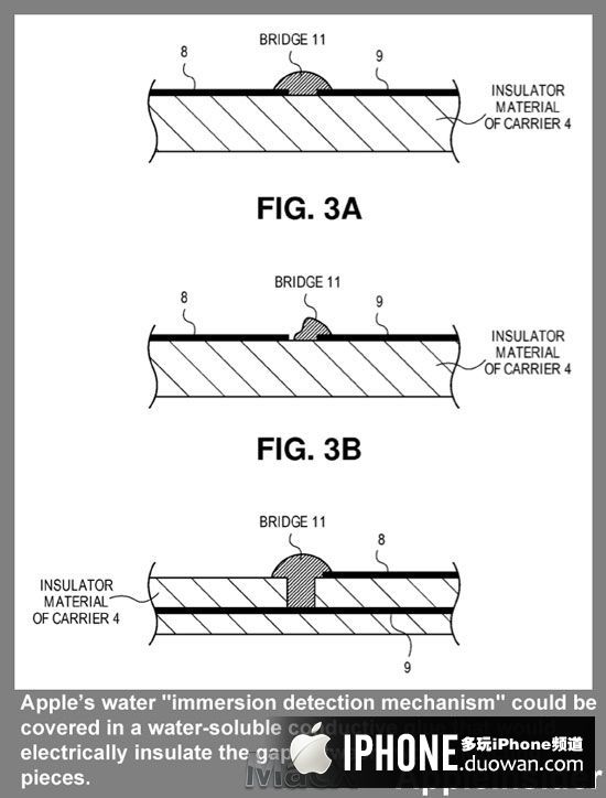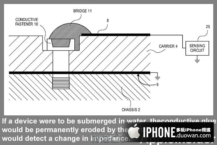 蘋果提出的解決方案是一種存在設(shè)備內(nèi)部的“侵入式檢測機(jī)制”。誰傳感器可以使用水溶性導(dǎo)電膠覆蓋,這樣一旦設(shè)備進(jìn)水,兩個(gè)傳感器之間就出現(xiàn)了隔離。在此之后,設(shè)備會將進(jìn)水的數(shù)據(jù)記錄下來。