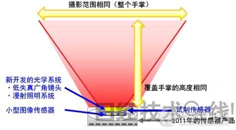 追求薄型小型化時,存在需要在保持原有認證性能的前提下減小受光面積的課題。而且,為了確保與已有系統(tǒng)之間的兼容性,還要防止與原來的手掌靜脈傳感器拍攝的圖像產(chǎn)生差異,以免對認證造成影響。為了解決這些課題,富士通研究所開發(fā)了以下兩項技術:[1]利用手機及網(wǎng)絡攝像頭使用的小型圖像傳感器的技術、[2]以實現(xiàn)兼容性為目的的光學設計技術。