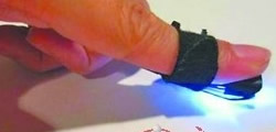 加拿大科技人員本月研發(fā)出了一個名為“魔指”(Magic Finger)的裝置,只要把它戴在手指頭上,你就可以讓任何表面變成一個觸摸屏,從而滑動使用。據(jù)悉,該裝置配備了一個微型攝像頭和光量傳感器,以識別服務(wù)并檢測用戶手指的移動。把“魔指”的尼龍指環(huán)套在手指上后,你可以使用一些手勢來操作電腦了。