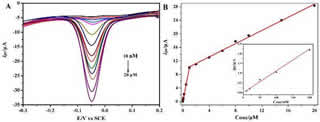 圖3. (A),OMCs/GCE在不同濃度對氧磷溶液(PBS緩沖液, pH6.0)的DPV圖。DPV測定參數(shù):平衡時間2s; 電位幅度, 50 mV; 脈沖周期,0.5s; 階躍高度, 4 mV; 頻率, 60 Hz。(B),濃度-電流曲線,內(nèi)插圖為10-200 nM區(qū)間內(nèi)的放大圖。