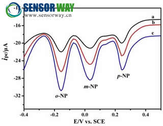 圖2. OMCs/GCE電極在三種硝基苯酚混合液(PBS緩沖液, pH4.8)中的DPV圖。p-NP, m-NP 和o-NP濃度分別為(a)10 μM,(b)20μM,(c)30 μM。DPV測定參數(shù):平衡時間,2s; 電位幅度, 50 mV; 脈沖周期,0.5s; 階躍高度, 4 mV; 頻率, 60 Hz。