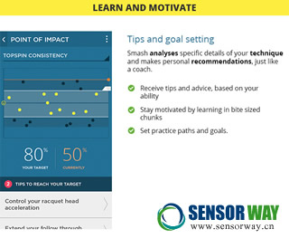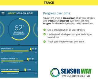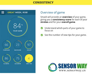 Smash網(wǎng)球運(yùn)動(dòng)監(jiān)測(cè)手環(huán)能夠充當(dāng)個(gè)人網(wǎng)球教練的角色,可以用來記錄發(fā)球的種類和次數(shù)、球拍頭的速度和軌跡、旋轉(zhuǎn)的數(shù)量、手腕的旋轉(zhuǎn)等信息。它還能通過這些數(shù)據(jù)計(jì)算出訓(xùn)練、比賽中動(dòng)作的一致性,從而矯正用戶的動(dòng)作。從某種意義上講,它可以在一定程度上充當(dāng)個(gè)人網(wǎng)球教練的角色。
