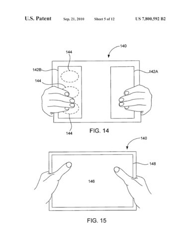 蘋果在2006年申請的該項專利。該專利通過在設(shè)備表面上的一個或者多個觸摸傳感器,來保護手持設(shè)備。這些傳感器可以獲取用戶手掌的像素圖像,與存檔中的相應(yīng)圖像進行比照,并依此設(shè)定設(shè)備的軟件和用戶資料。