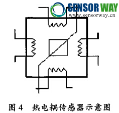 硅微熱電耦式的加速度傳感器目前多應(yīng)用于低 成本的傳感器領(lǐng)域,此類(lèi)加速度傳感器既可以測(cè)量 動(dòng)態(tài)加速度,也可以測(cè)量靜態(tài)及速度;跓峤粨Q 原理,介質(zhì)是氣體。如圖4所示,熱源處于硅片的中 央,硅片懸在空穴中間。在熱源的四周均勻分布有 熱電耦堆(鋁/多晶硅h圖中的加速度傳感器上有 兩路信號(hào),一路是測(cè)量X軸加速度的,另一路是測(cè) 量3"軸加速度的。在沒(méi)有加速度的情況下,熱源的 溫度梯度均勻分布,對(duì)四周的熱電耦而言,溫度是一 樣的,輸出的電壓也是一樣的。熱自由交換,任何方 向的加速度將打破溫度分布平衡,使之分布不平衡。 輸出的電壓也將隨之改變。熱電稱(chēng)輸出的電壓差和 加速度成正比例。