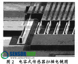 硅微電容式加速度傳感器的敏感部分通常為梳齒結(jié)構(gòu),如圖1所示,其掃描電鏡顯微照片如圖2所示。敏感元件由活動(dòng)部分A、B和固定電極三部分 組成。其中,活動(dòng)部分由超靜定梁、質(zhì)量塊以及與質(zhì) 量塊相連的活動(dòng)電極組成。整個(gè)梳齒結(jié)構(gòu)分成A和B兩部分,固定電極分成固定電極ti和固定電極 W固定電極a與上半部分活動(dòng)電極組成電容Ca, 固定電極b與下半部分活動(dòng)電極組成電容設(shè) 計(jì)時(shí),將上、下極板不同區(qū)域的電極的引線分開(kāi),實(shí)驗(yàn)時(shí),可根據(jù)需要將其短接或分開(kāi)接。當(dāng)有加速度 A輸人時(shí),慣性力使活動(dòng)極板產(chǎn)生1個(gè)偏角α使電容器C1的電容量增加,C2的電容量減小,通過(guò)線 路轉(zhuǎn)換,把電容器C1、C2的電容量轉(zhuǎn)換成電信號(hào), 經(jīng)相敏放大后把輸出電壓反饋到電容靜電力矩器,電容力矩器產(chǎn)生的靜電力矩與慣性力矩平衡,使式中: