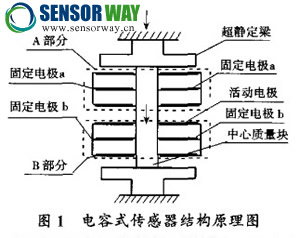 硅微電容式加速度計(jì)的工作原理如圖3所示。 在受到加速度作用時(shí),在慣性力-作用下,檢測(cè) 質(zhì)量塊在z方向運(yùn)動(dòng)。這使動(dòng)極板兩側(cè)的電容Ca、 Cb發(fā)生了變化。兩側(cè)電容的差值(2倍于單側(cè)的變 化量)經(jīng)激勵(lì)正弦波信號(hào)調(diào)制,由電容檢測(cè)器檢出。