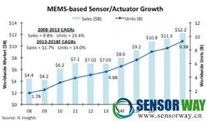 根據(jù)IC Insight的報告,在經(jīng)歷了增速趨緩之后,MEMS傳感器市場重回升勢。主要原因是新一代的設備和應用的發(fā)展,包括多傳感器平臺、物聯(lián)網(wǎng)以及可穿戴設備。