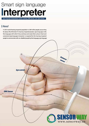 據(jù)報道,韓國3名設(shè)計師構(gòu)思了一款能解讀手語的翻譯手環(huán),把它套在手腕即可將手語轉(zhuǎn)換成語音,這將有助打破聾啞人士與正常人的溝通障礙。據(jù)報道,這只名為“Smart Sign Language Interpreter”的手語翻譯手環(huán),內(nèi)置距離傳感器,陀螺儀傳感器,肌電傳感器等。由設(shè)計師師Jeon Sung-Su、Ku Ja-Yun及Lee Seo-Yong共同設(shè)計,并獲德國著名的紅點設(shè)計大獎概念設(shè)計獎。