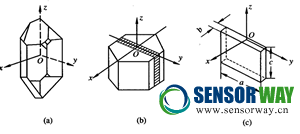 石英晶體(Quartz Crystal)是二氧化硅無水化合物,分子式為Si02,是各向異性的材料,通常用直角坐標(biāo)軸來表征它的方向性。典型的石英晶體外形和直角坐標(biāo)軸,X切割的石英晶體片如圖1所示。Z軸是石英晶體的對稱軸,在垂直于Z軸的平面上,通過相對兩棱的直線叫X軸,由于石英晶體呈六角棱形,因此有三個(gè)X軸。與X軸和Z軸都垂直的是Y軸。X軸稱為電軸,Y軸稱為中性軸(或機(jī)械軸)Z軸稱為光軸。通常所說的X(或Y)切割,就是切割出來的石英晶體片的兩個(gè)平面都與X(或Y)軸相。