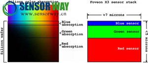 簡單來說,這項技術(shù)有點像適馬Foveon X3傳感器的衍生版本。Foveon X3是將藍(lán)、綠、紅三色層按照波長自上而下排列,TFD同樣也利用了不同波長(色彩)光線在硅材料里的傳播特性。但不同的地方在于,TFD用硅材料替換掉了原先的標(biāo)準(zhǔn)RGB陣列,并把不同深度的色彩數(shù)據(jù),分多層記錄下來。