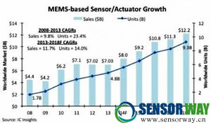 IC Insights預(yù)期,MEMS組件(包含傳感器與驅(qū)動器)市場規(guī)模在2014年可達(dá)到80億美元,成長率是14%;至于明年,該機構(gòu)預(yù)期MEMS市場將進(jìn)一步成長16%,營收規(guī)模92億美元。在2013至2018年間,預(yù)期該市場平均年復(fù)合成長率為11.7%,整體規(guī)模將在2018年達(dá)到122億美元;至于MEMS組件出貨量則成長速度更快,在同一期間平均年成長率可達(dá)14%,而這也是MEMS組件平均價格出現(xiàn)大幅下降的主要原因。