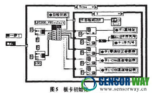 該模塊的功能是實(shí)現(xiàn)檢驗(yàn)并初始化板卡,然后設(shè)置系統(tǒng)基本參數(shù)來控制硬件系統(tǒng),既可以無觸發(fā)采集,又可以單通道觸發(fā)采集數(shù)據(jù)。在啟動(dòng)采集之前,首先對(duì)LDl200初始化,確定自檢成功或提示“無LDl200卡”,程序如圖5所示。