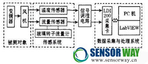 本設(shè)計(jì)將LabVIW軟件、多傳感器、計(jì)算機(jī)結(jié)合,構(gòu)建了一個(gè)空氣流量測(cè)試系統(tǒng),實(shí)現(xiàn)對(duì)多傳感器信息的融合。系統(tǒng)包括被測(cè)對(duì)象、傳感系統(tǒng)、信號(hào)調(diào)理電路、數(shù)據(jù)采集與處理系統(tǒng),系統(tǒng)框圖如圖1所示。