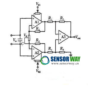 在許多需要數(shù)字采集的系統(tǒng)中,傳感器輸出的模擬信號(hào)都很微弱,必須通過1個(gè)模擬放大器對(duì)其進(jìn)行一定倍數(shù)的放大,才能滿足采集卡對(duì)輸入信號(hào)電平的要求,這種情況下,就需要采用信號(hào)調(diào)理電路對(duì)傳感器輸出的信號(hào)量進(jìn)行放大。信號(hào)調(diào)理電路使輸出電壓與輸入電壓成正比,它的核心是1個(gè)具有電容負(fù)反饋、且輸入阻抗極高的高增運(yùn)算放大器。差動(dòng)儀表放大器如圖2所示。