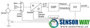 DLVR 是一個帶有信號路徑的數(shù)據(jù)傳感器,包括一個傳感元件、一個 14 位模數(shù)轉(zhuǎn)換器、一個 DSP 和一個支持 I²C 或 SPI 的 I/O 塊(圖 1b)。 傳感器同時包括內(nèi)部溫度基準和相關(guān)的控制邏輯,以支持配置的操作模式。 傳感元件不采樣時會關(guān)斷,以節(jié)省電能。 既然有一個單 ADC,那么在 ADC 前端也會有一個多路復用器,為該 ADC 選擇信號來源。