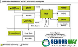 血壓計的基本功能是測量動脈壁的壓力。其中一個獲得該測量數(shù)據(jù)的方法是使用一個可測量當(dāng)前壓力的壓力傳感器。血壓的不斷變化改變了控制空氣泵的電機(jī)的速率。氣囊壓向胳膊,使其產(chǎn)生收縮壓。當(dāng)達(dá)到收縮壓時,圍繞在胳膊上的氣門會漸漸釋放空氣。同時,壓力傳感器會進(jìn)行測量。
