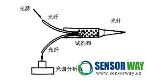 用來測定活體組織和血液值pH光纖光譜傳感器示意圖,如圖3所示。其工作原理是利用發(fā)射光、透射光的強(qiáng)度隨波長的分布光譜來進(jìn)行測量。這種傳感器將兩根光纖插入可透過離子的纖維素膜盒中.膜盒內(nèi)裝有試劑,當(dāng)把針頭插入組織或血管后,體液滲入試劑,導(dǎo)致試劑吸收某種波長的光.用光譜分析儀測出此種變化,即可求得血液或組織的pH值。