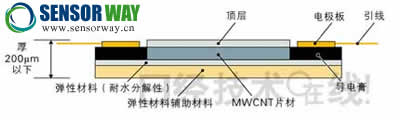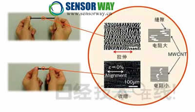 這種傳感器的開(kāi)發(fā)源于鈴木到靜岡大學(xué)從事碳納米管(CNT)研究。其中重要的研究就是多層管結(jié)構(gòu)“MWCNT(multi wall CNT)”。普通CNT的長(zhǎng)度為μm級(jí),呈粉末狀或分散液狀態(tài),而靜岡大學(xué)開(kāi)發(fā)的MWCNT長(zhǎng)度為mm級(jí),呈長(zhǎng)纖維狀。MWCNT在基板上生長(zhǎng)到足夠大以后,用鑷子等工具對(duì)其進(jìn)行拉伸,可以將MWCNT作為片材取出。