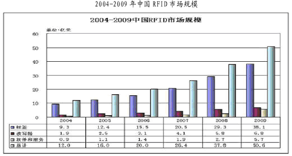 易觀國際預(yù)測,2009年中國RFID市場規(guī)模將達(dá)到50億元,年復(fù)合增長率為33%,其中電子標(biāo)簽超過38億元、讀寫器接近7億元、軟件和服務(wù)達(dá)到5億元的市場格局。